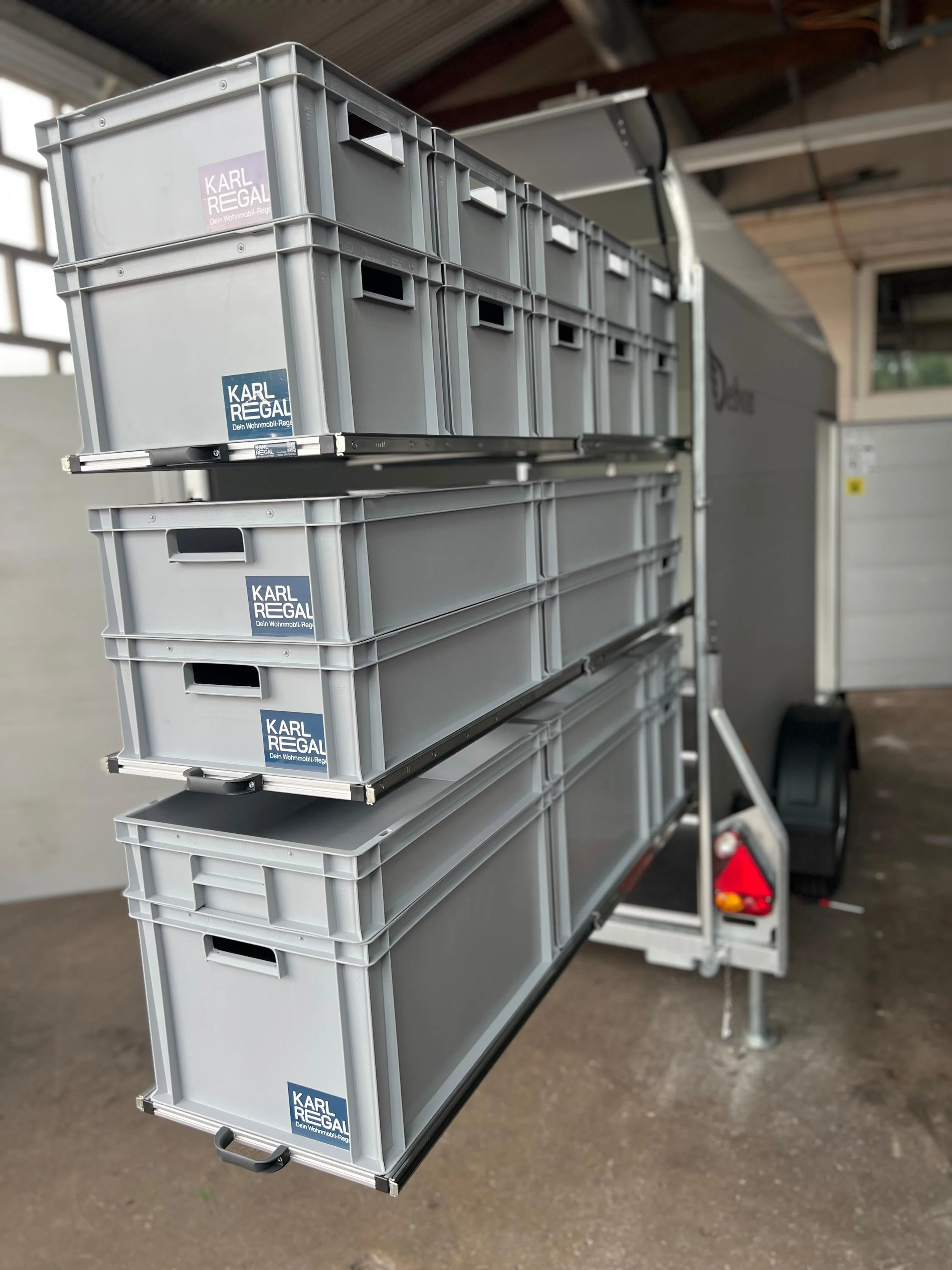 Wir lösen dieses Problem mit unserem Auszugssystem. Dein Anhänger wird mit Hilfe des Systems von außen beladen und die Auszüge haben auf Wunsch eine Traglast von bis zu 250 kg.
